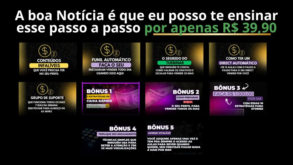 A proposta é simples e clara: você está tendo a oportunidade de criar a sua estrutura do Instagram e aprender todas as minhas Técnicas de Vendas para começar a VENDER todos os dias, sem aparecer.